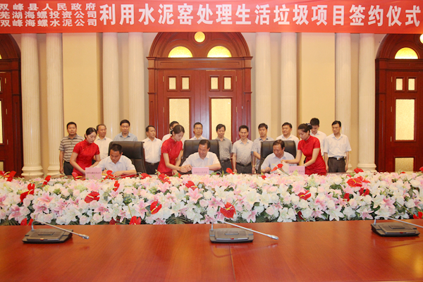 ? ? 2014年6月29日上午,雙峰縣人民政府、蕪湖海螺投資公司、雙峰海螺公司在蕪湖海螺國際會議中心東海廳正式簽署了《關(guān)于雙峰縣利用水泥窯協(xié)同處理城市生活垃圾項目合作協(xié)議》,雙峰縣縣長楊維,縣委常委、副縣長龍燕青,縣人大常委會副主任李仲喬;海螺創(chuàng)業(yè)總經(jīng)理紀(jì)勤應(yīng)、副總經(jīng)理李大明;雙峰海螺副總經(jīng)理萬天靜等參加了簽約儀式。