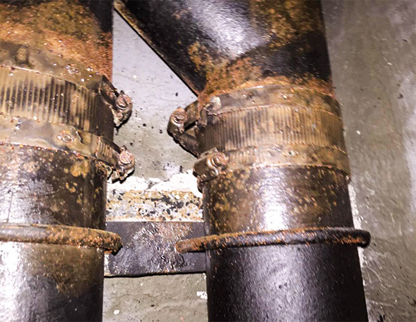 除了管材管件应该符合国家标准以外,最重要的就是连接配件,市面上数不清的小厂卡箍以假乱真,用肉眼根本无法识别,如果黑心的商家选用了劣质200系列材质的卡箍后果不堪设想,不仅极易被腐蚀,而且容易断裂。如上图所示,仅仅使用了10个月的201材质卡箍出现了腐蚀、断裂的情况。